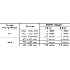 Характеристики Входной ток: AC100-240В 50-60 Гц Структура входного разъема: съемная вилка Контроль зарядки: таймер (13 часов) Индикация: 2 LED индикатора (зарядка ON, заряжен OFF) Заряжаемые аккумуляторы: AA x 2, 4 / AAA x 2, 4 ячейки Продолжительность зарядки: АА примерно 10...