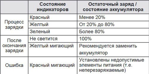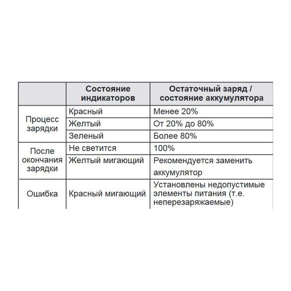 - Световая индикация уровня заряда позволяет определить сколько энергии осталось в аккумуляторе и сколько времени будет необходимо для зарядки аккумуляторов.