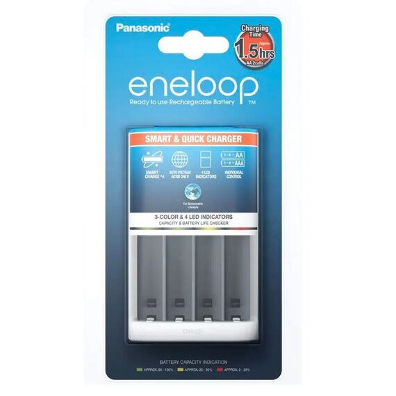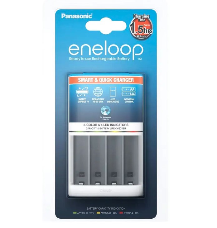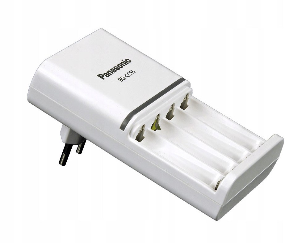Panasonic Smart Quick Charger - новое быстрое интеллектуальное зарядное устройство от Panasonic. Panasonic BQ-CC55E имеет 4 полностью независимых канала для зарядки Ni-MH и Ni-CD аккумуляторов формата АА и ААА. Отличительной особенностью модели является наличие LED индикации уровня заряда аккумуляторов. Над каждым каналом расположен трехцветный светодиодный индикатор, который позволяет определить уровень заряда аккумуляторов в процессе заряда.